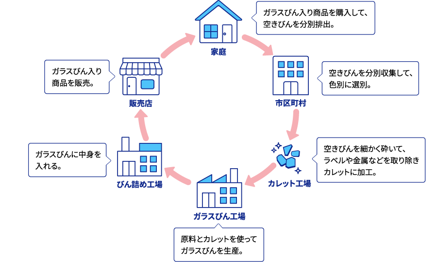 こうした両面をもって、ガラスびんが何度でもガラスびんに生まれ変わる、「びんtoびん」水平リサイクルが実現されているのです。