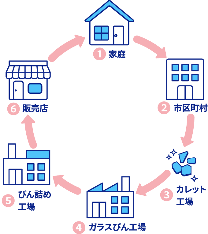 家庭から排出された空きびんは自治体によって収集され、資源化センターで選別したあと、ガラスびんの原料となる再生原料(カレット)に加工されます。カレットを利用することで溶融効率が向上するため、ガラス溶融に必要なエネルギーを節約し、CO₂排出量を削減することができます。