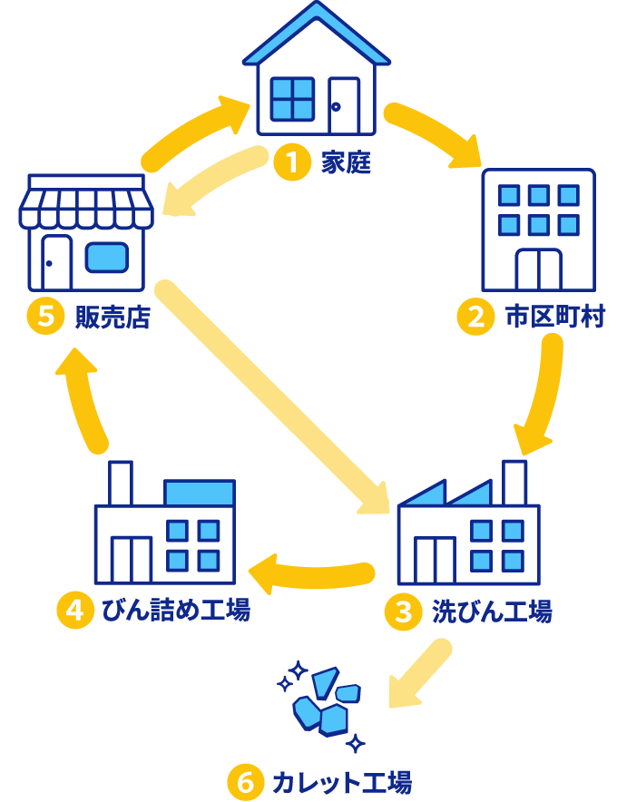 - 自治体、小売店と協力してリターナブルびんの回収、選別、処理を担当するびん専門事業者