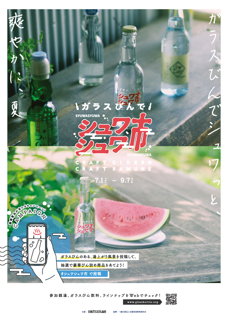 「ガラスびんでシュワシュワ市」は、全国各地の“シュワシュワ”なご当地飲料、びん入りの地サイダーや地ラムネを楽しめる夏の恒例イベントです。